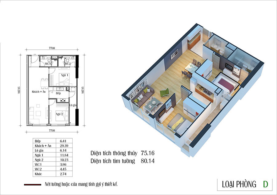 – Căn hộ 2PN (65–80m²): lựa chọn phổ biến của các gia đình trẻ. Thiết kế hợp lý giữa phòng khách, bếp, 2 phòng ngủ tách biệt, tạo sự riêng tư nhưng vẫn gần gũi.